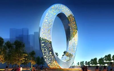 地產類不銹鋼雕塑以大氣磅礴為主要表現形式,一般都是抽象的,傳遞一種視覺上的震撼效果,常見如圓環(huán)、鏤空球、云朵、假山、浪花、水滴等等。